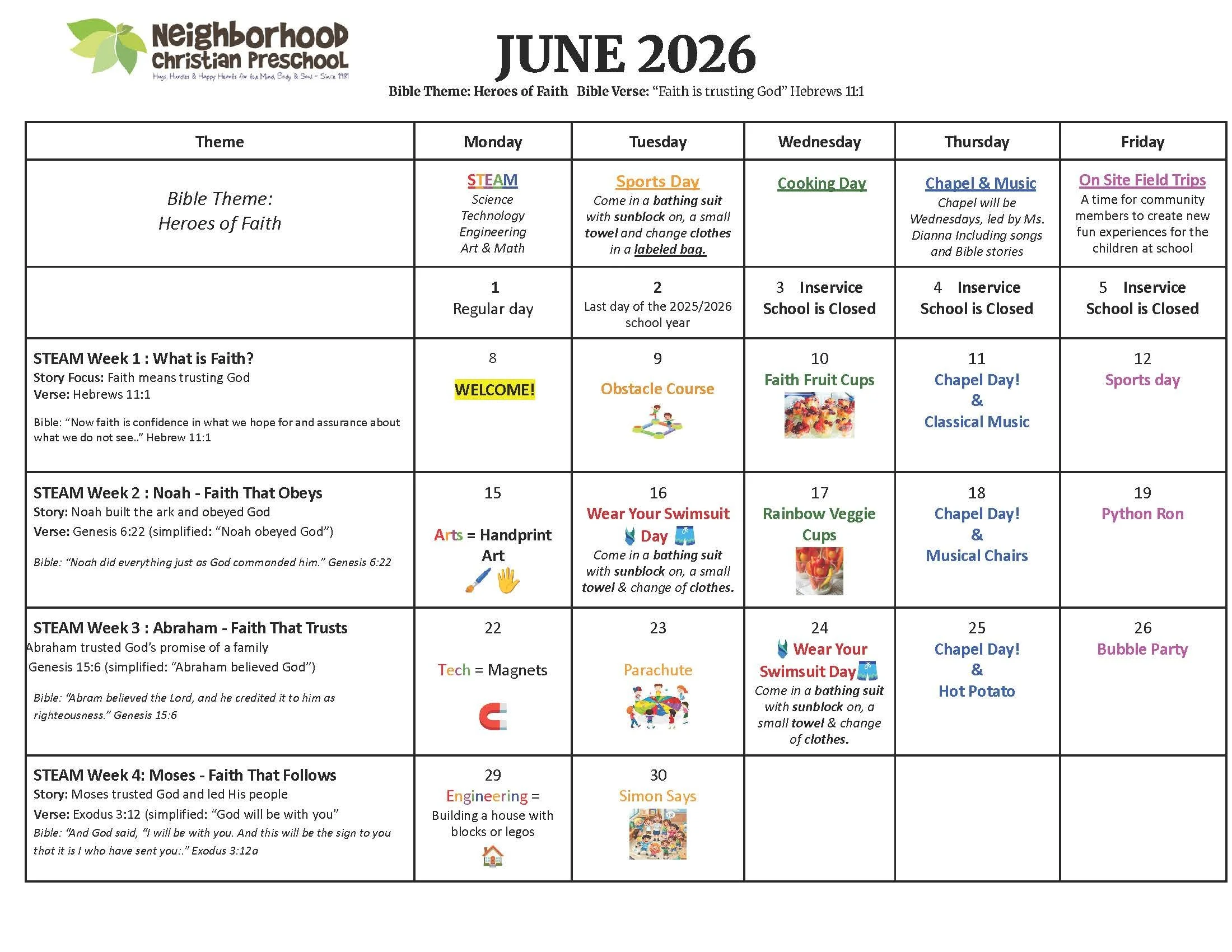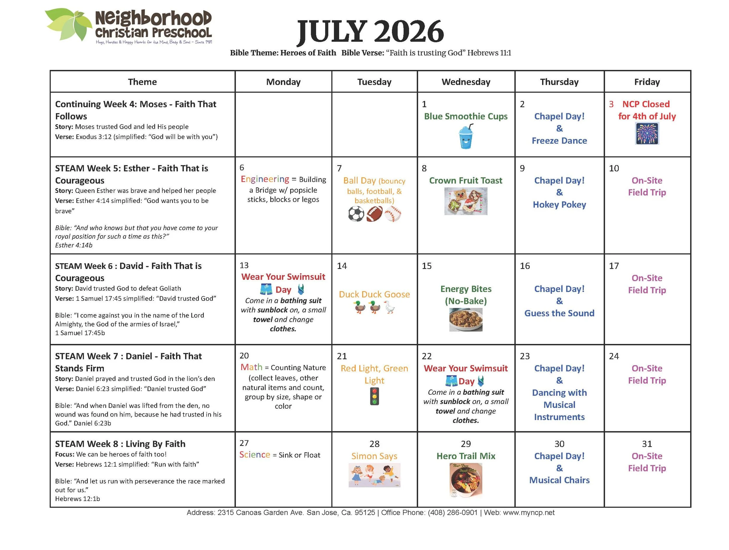 Morning devotionals, worship songs, and prayer weave faith into every day, helping children grow in God’s love.Weekly Guests & Water Play